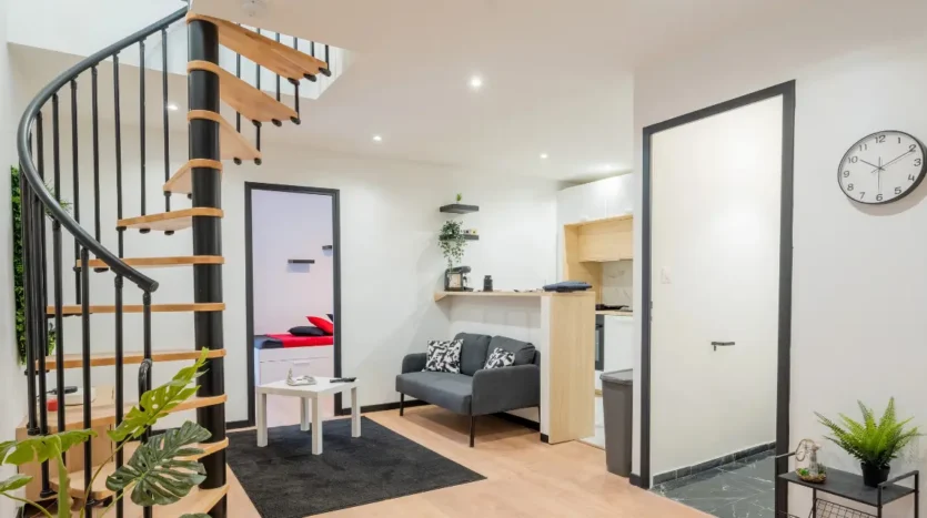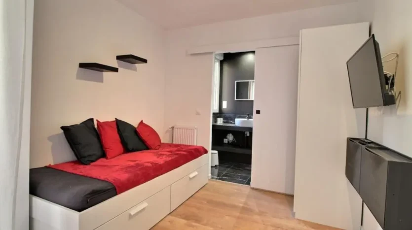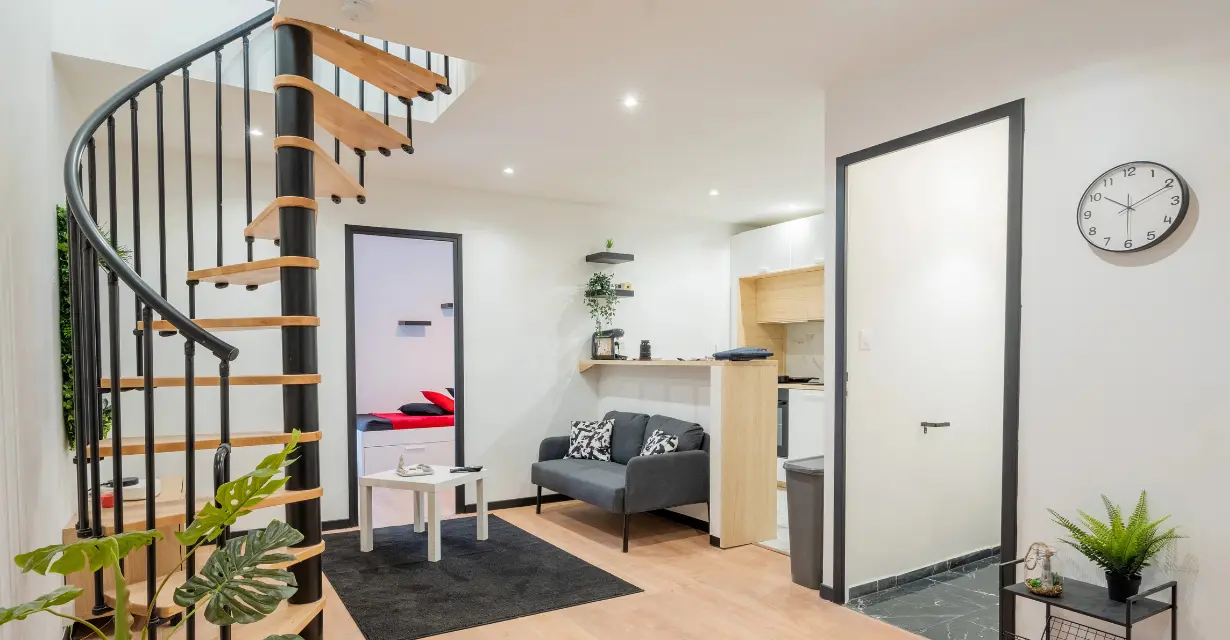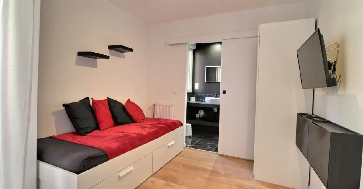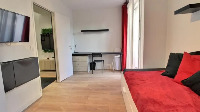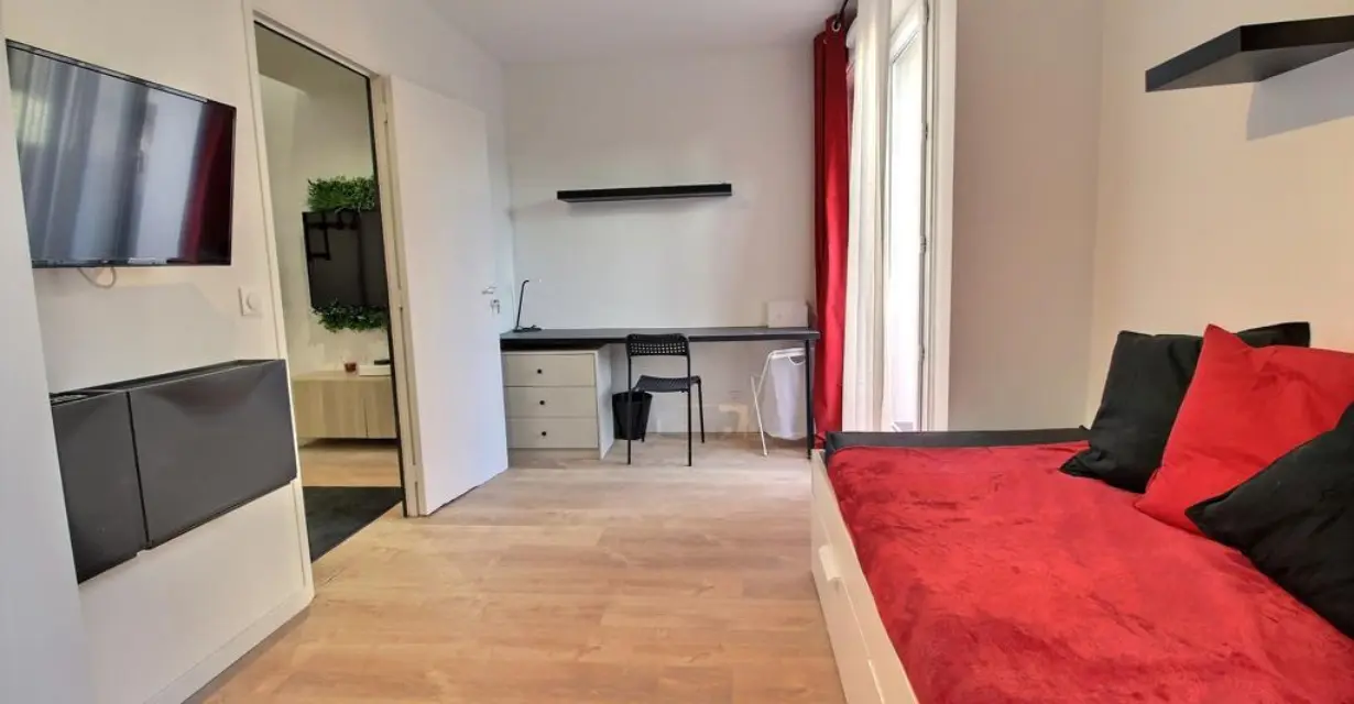 Découvrez cette charmante chambre Rouge, idéale pour un(e) étudiant(e) ou un(e) jeune actif(ve), située dans un duplex moderne avec de grandes terrasses à l’étage.