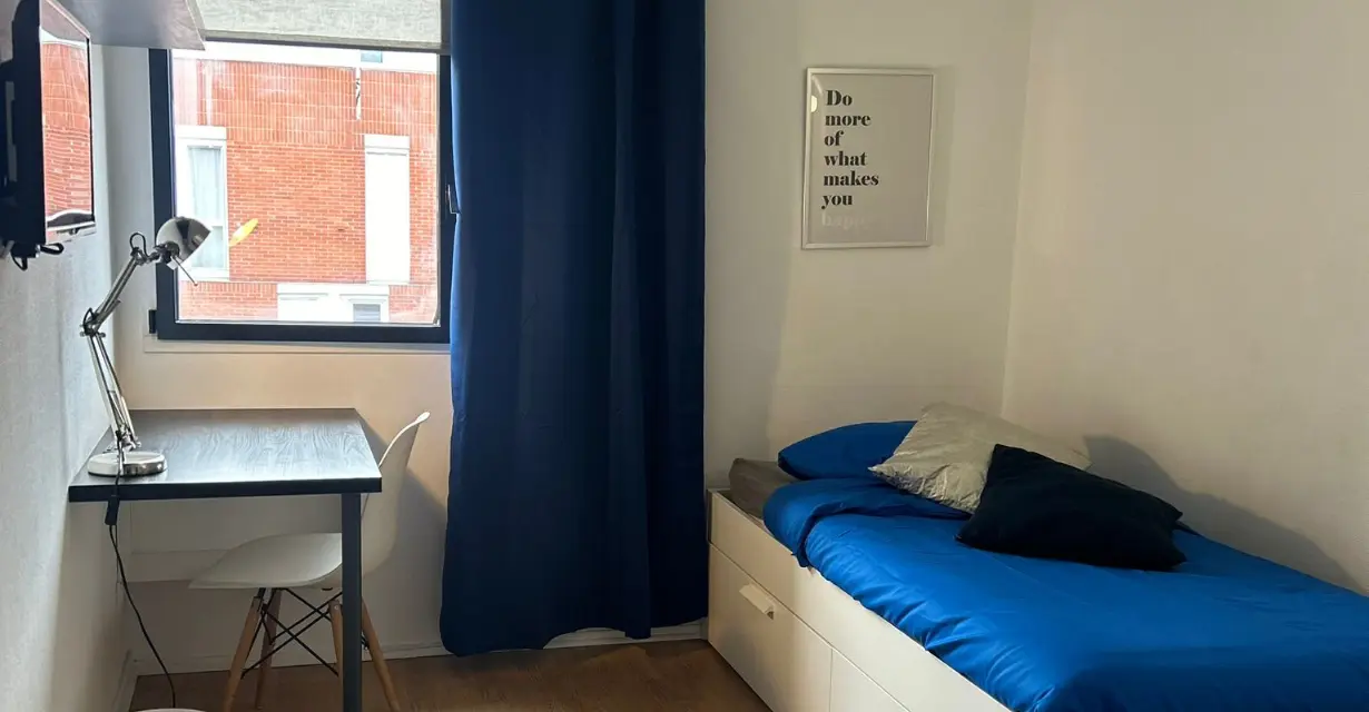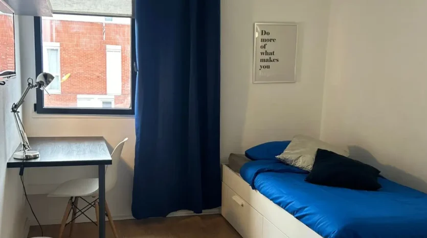 La chambre est calme, lumineuse, et offre un cadre agréable pour étudier ou se détendre. Les colocataires partagent une cuisine ouverte sur un salon convivial, ainsi que des espaces communs bien aménagés.