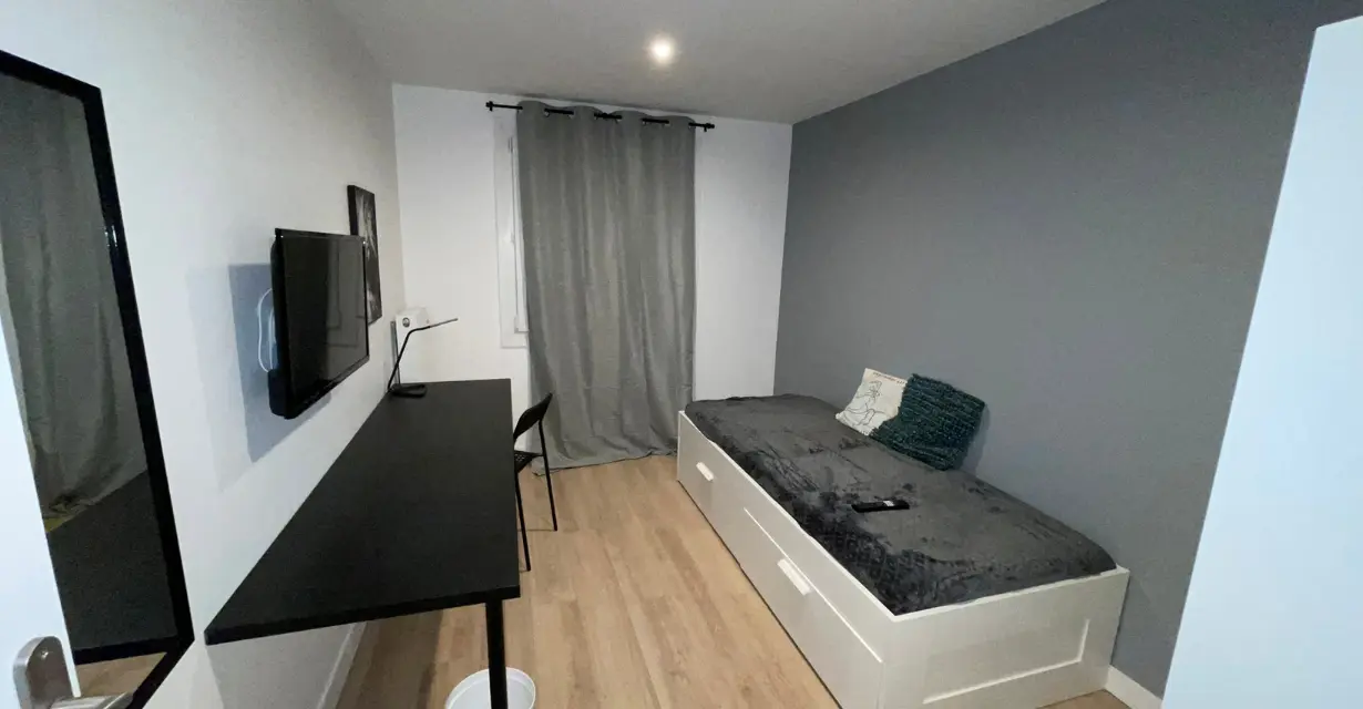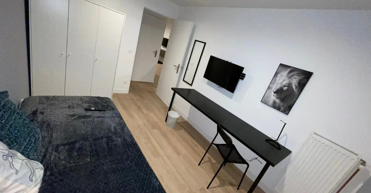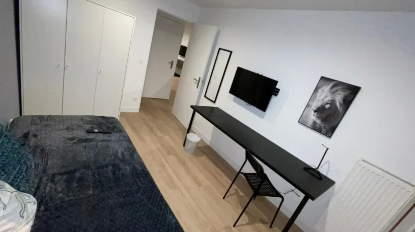 La chambre est calme, lumineuse, et offre un cadre agréable pour étudier ou se détendre. Les colocataires partagent une cuisine ouverte sur un salon convivial, ainsi que des espaces communs bien aménagés.