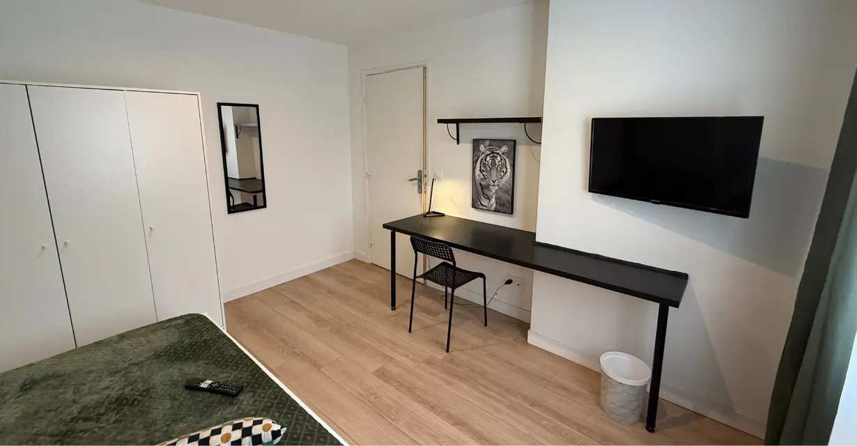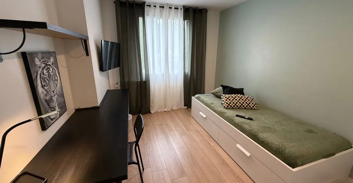 La chambre est calme, lumineuse, et offre un cadre agréable pour étudier ou se détendre. Les colocataires partagent une cuisine ouverte sur un salon convivial, ainsi que des espaces communs bien aménagés.